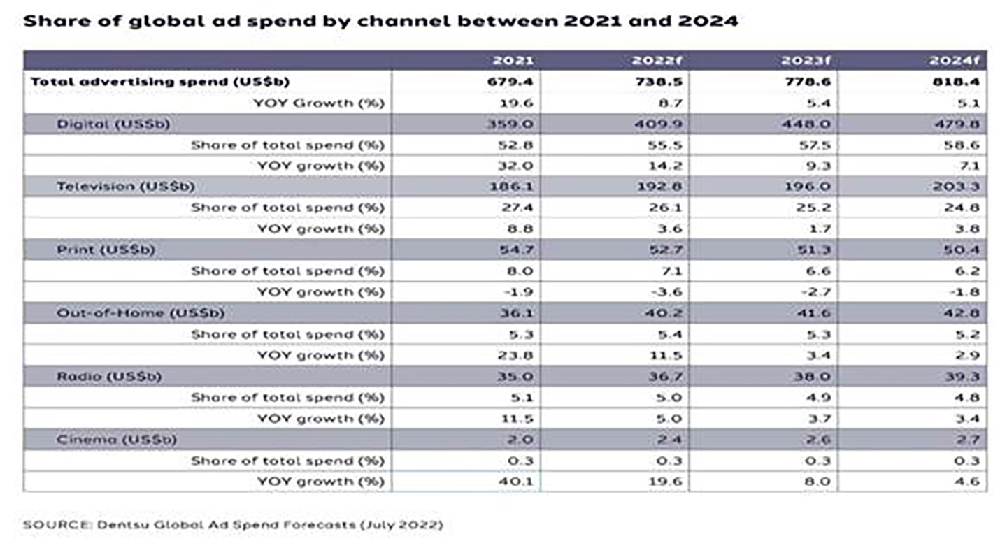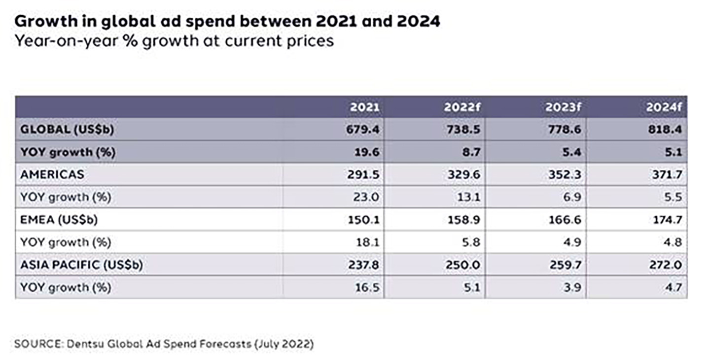 Looking ahead, dentsu expects the 2023 global advertising market to increase by 5.4% to reach US$778.6 billion followed by a further 5.1% increase in 2024.
