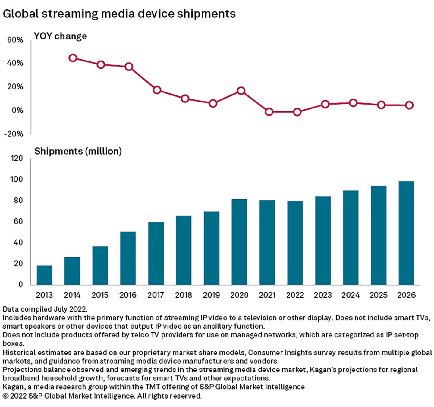 SEOUL, SOUTH KOREA — Global streaming media device shipments are expected to fall 1.2% to an estimated 80.0 million units in 2022 as inflationary pressures keep many consumers on the sidelines, according to Kagan, a media research group within S&P Global Market Intelligence.