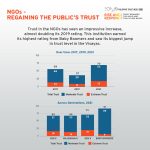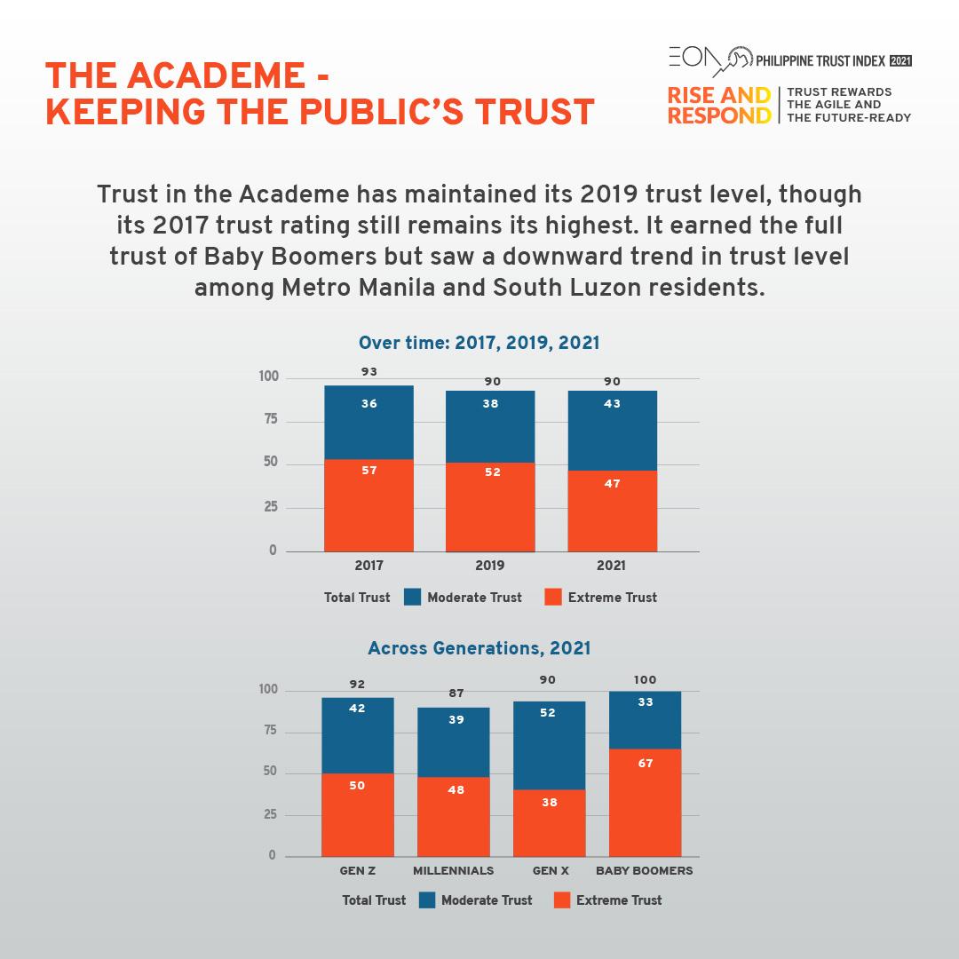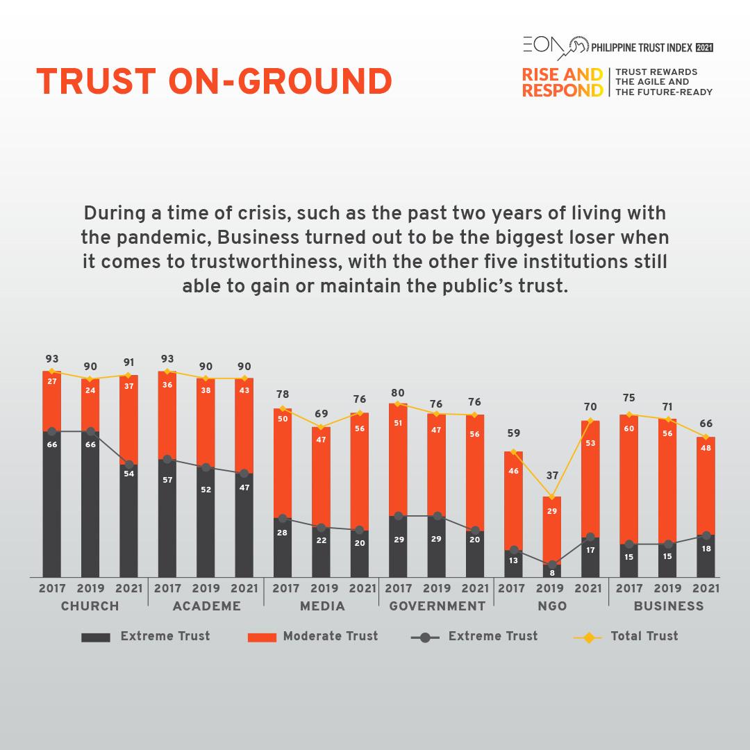 The 2021 PTI, titled RISE & RESPOND: Trust Rewards the Agile and the Future-Ready, reveals that the trust level for the business sector declined while the other five institutions were able to maintain or even increase public trust in them from 2019. Four of them, notably the Church, the Academe, the Media, and Non-Governmental Organizations (NGOs), saw a rise in trust. NGOs, in particular, saw the highest gain, nearly doubling its 2019 trust rating this year. The government’s level of trust, however, has remained constant since 2019.