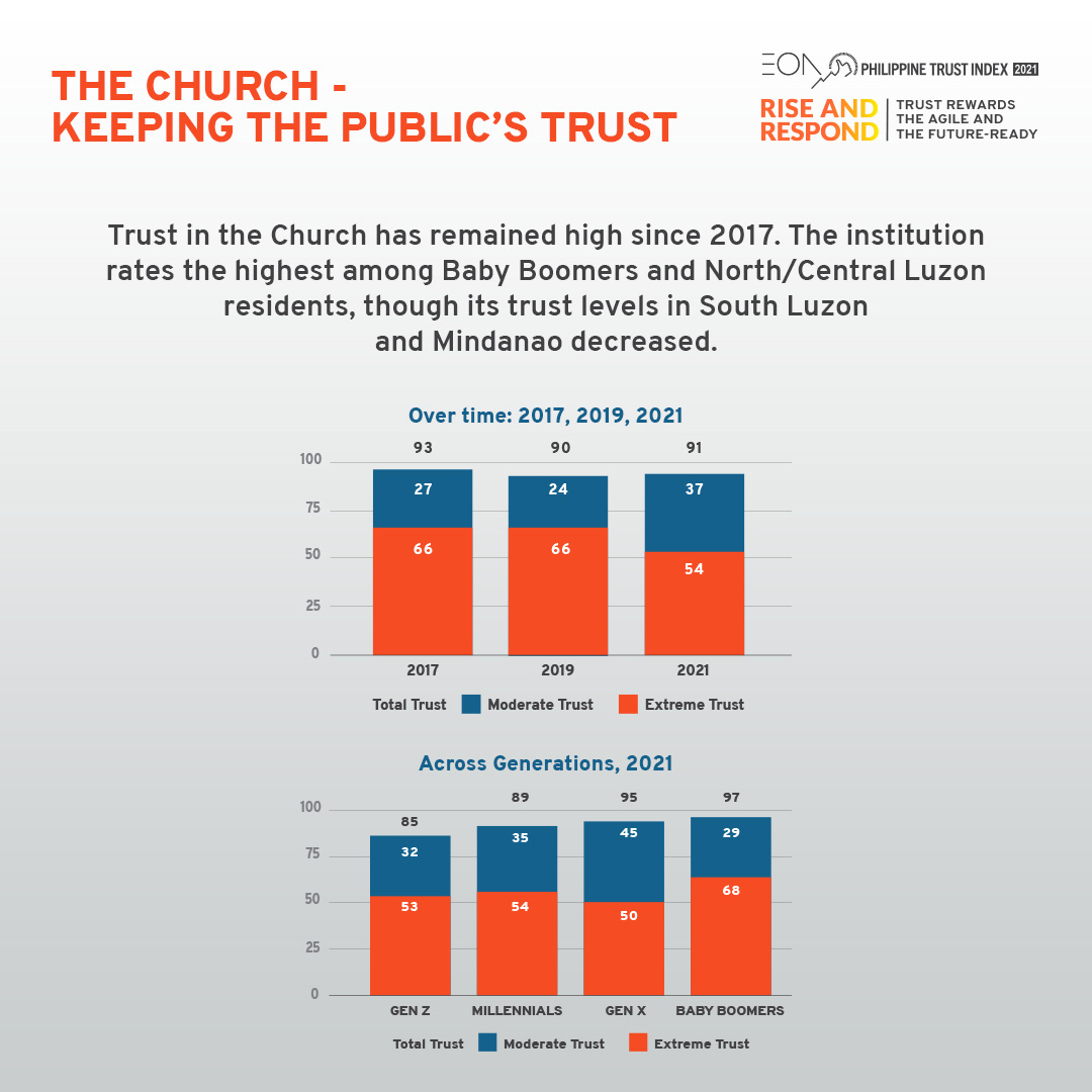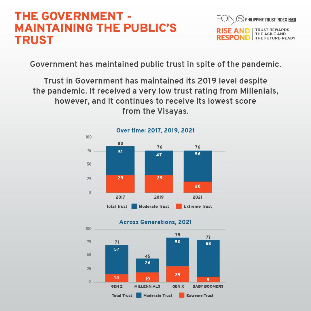 Aside from their trust levels, the study also delves into how the pandemic has changed the Filipinos’ perception of each institution’s trustworthiness based on their respective responses to the ongoing crisis. In this aspect, only the government saw the change in its negative perception outweigh the change in its positive one. “The pandemic has definitely taken a toll on us and has magnified the importance of trust,” says Junie del Mundo, co-founder and Chief Executive of the EON Group. “This year’s PTI will give you a better understanding of the state of trust in the Philippines, especially in a society that was torn apart by the cruel effects of a pandemic and the restrictions that it allowed to happen.”