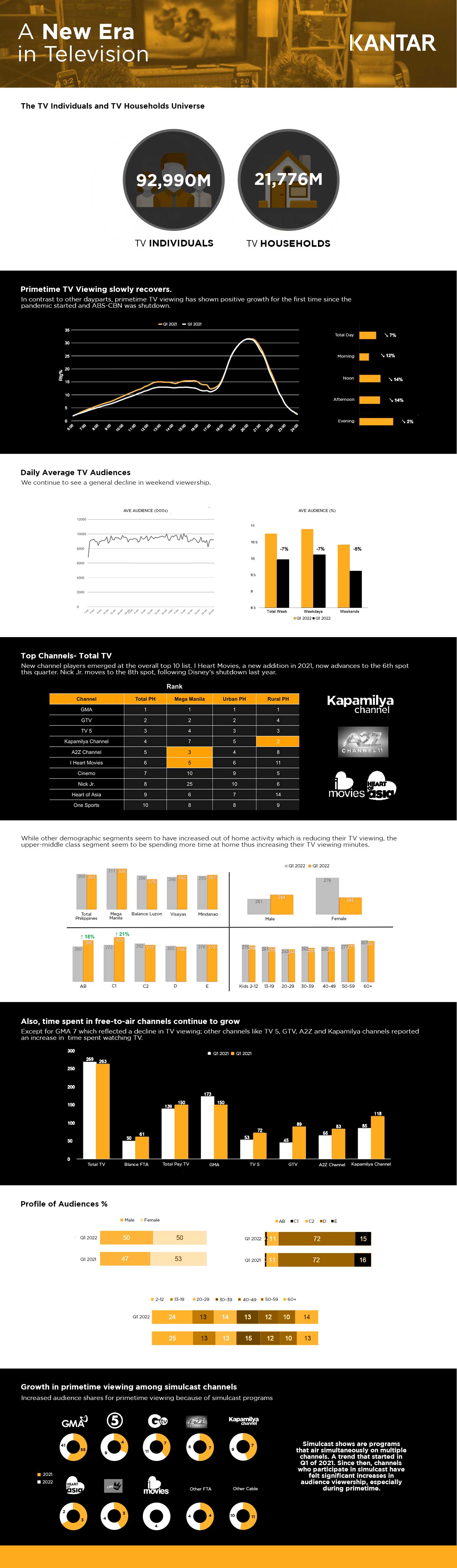 Kantar notes that there are presently 21.7 million households with televisions in the Philippines with 92.9 million individuals watching television. Compared to the first quarter of 2021, the first quarter of 2022 saw positive growth in primetime viewing for the first time since the pandemic started and broadcast giant ABS-CBN was shut down.