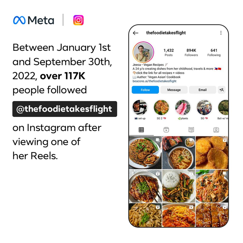 However, one of the most notable Reels-related accomplishments for 2022, goes to vegan recipe developer and Meta Creator of Tomorrow Jeeca Uy. Jeeca is the innovative home cook behind The Foodie Takes Flight, and between January 01 to September 30, she gained more than 117,000 new Instagram followers after they viewed one of her Reels.