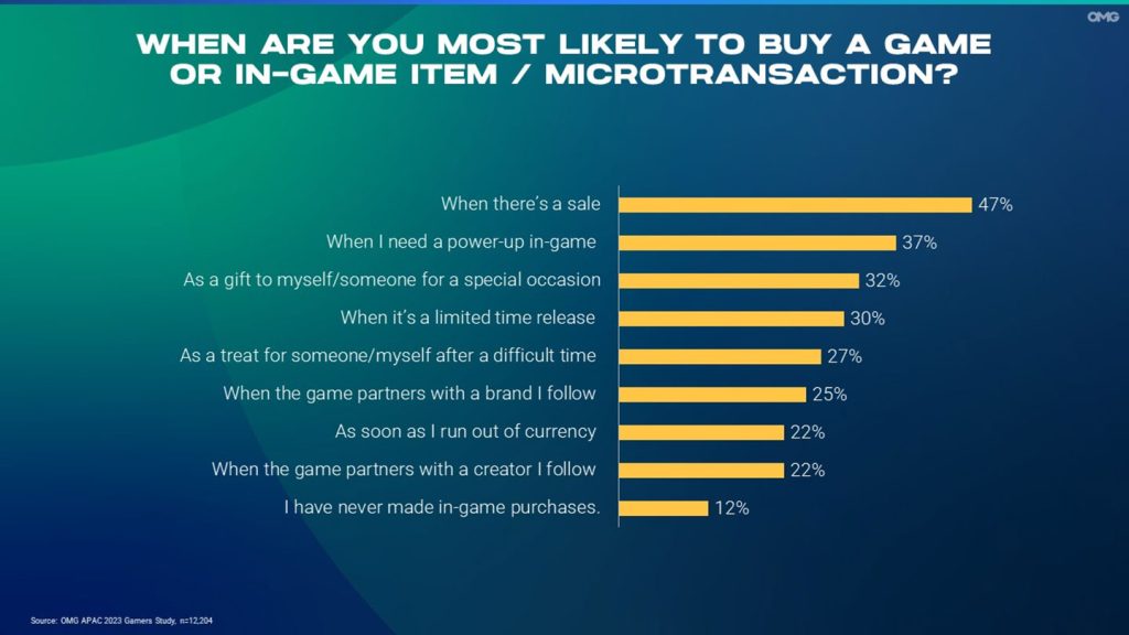 Some gamers are value-driven, aiming to get the best savings from games. Nearly half of APAC gamers (47%) will make an in-game purchase or microtransaction when there is a sale or when they need to power up (37%). Some also see it as gifts for special occasions (32%) or will only purchase it when it is a limited-time release (30%).
