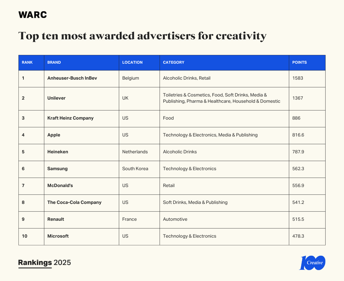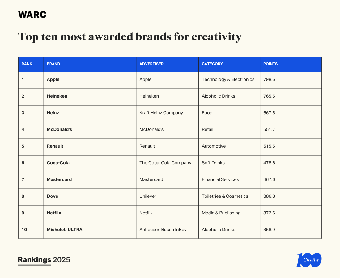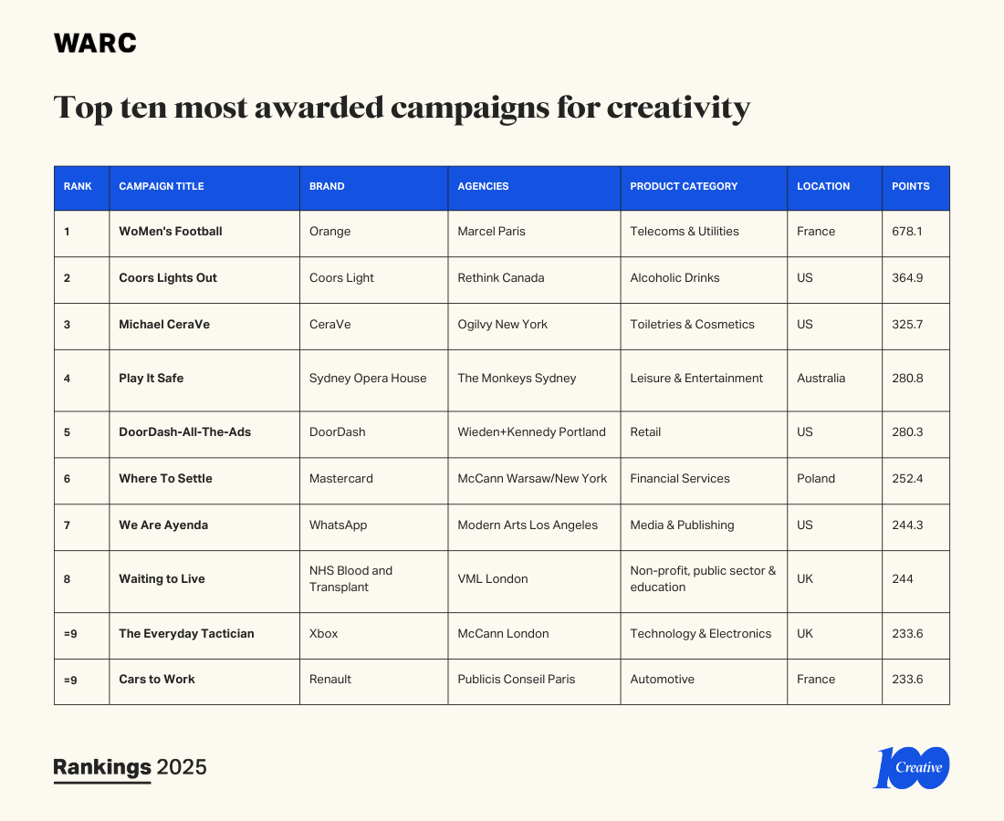 The top ten most highly ranked campaigns and companies in the WARC Rankings Creative 100 2025 are: