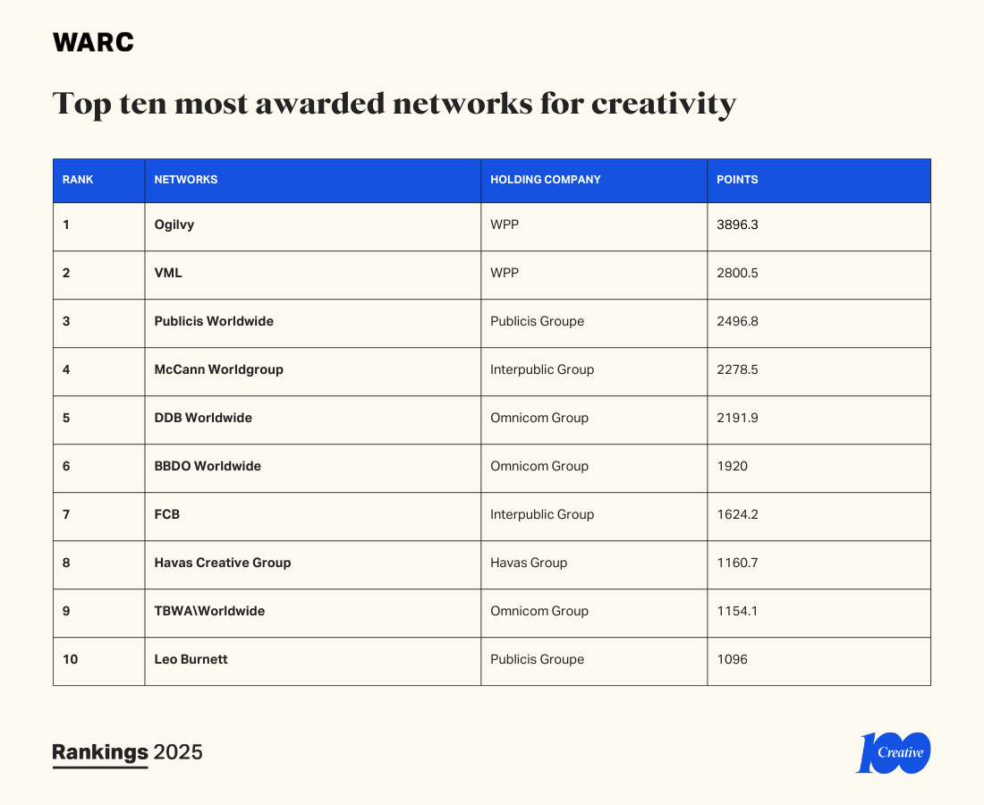 Rob Reilly, Global Chief Creative Officer, WPP, says: “Topping the WARC Creative 100 for the third year running is a testament to the relentless creativity and dedication of our teams worldwide. Seeing Ogilvy named Network of the Year again, with VML securing the second spot, is a powerful demonstration of our creative strength. Thank you to our incredibly talented agency teams and, most importantly, to our brave clients who trust us to bring their visions to life. We couldn’t do it without them. It’s humbling and inspiring.”