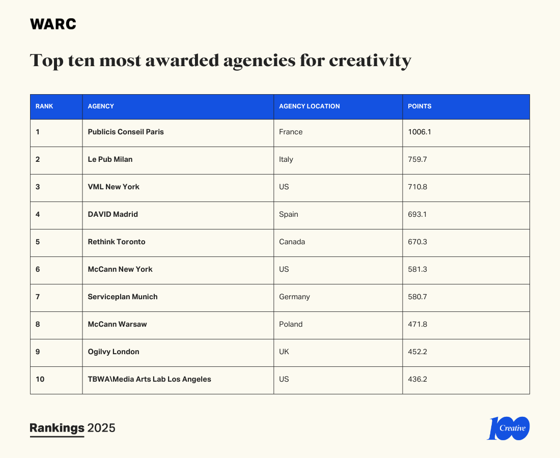 Marco Venturelli, Global Chief Creative Officer/CEO Leo and Chief Creative Officer, Publicis Conseil, said: “After being named Agency of the Year at Cannes Lions in June, we are proud to be the #1 agency in the WARC Creative 100 as we approach our 100th anniversary. This is a testament to our creative ambition with legacy clients and our commitment to progressive work. Congrats to all our talents and clients!”