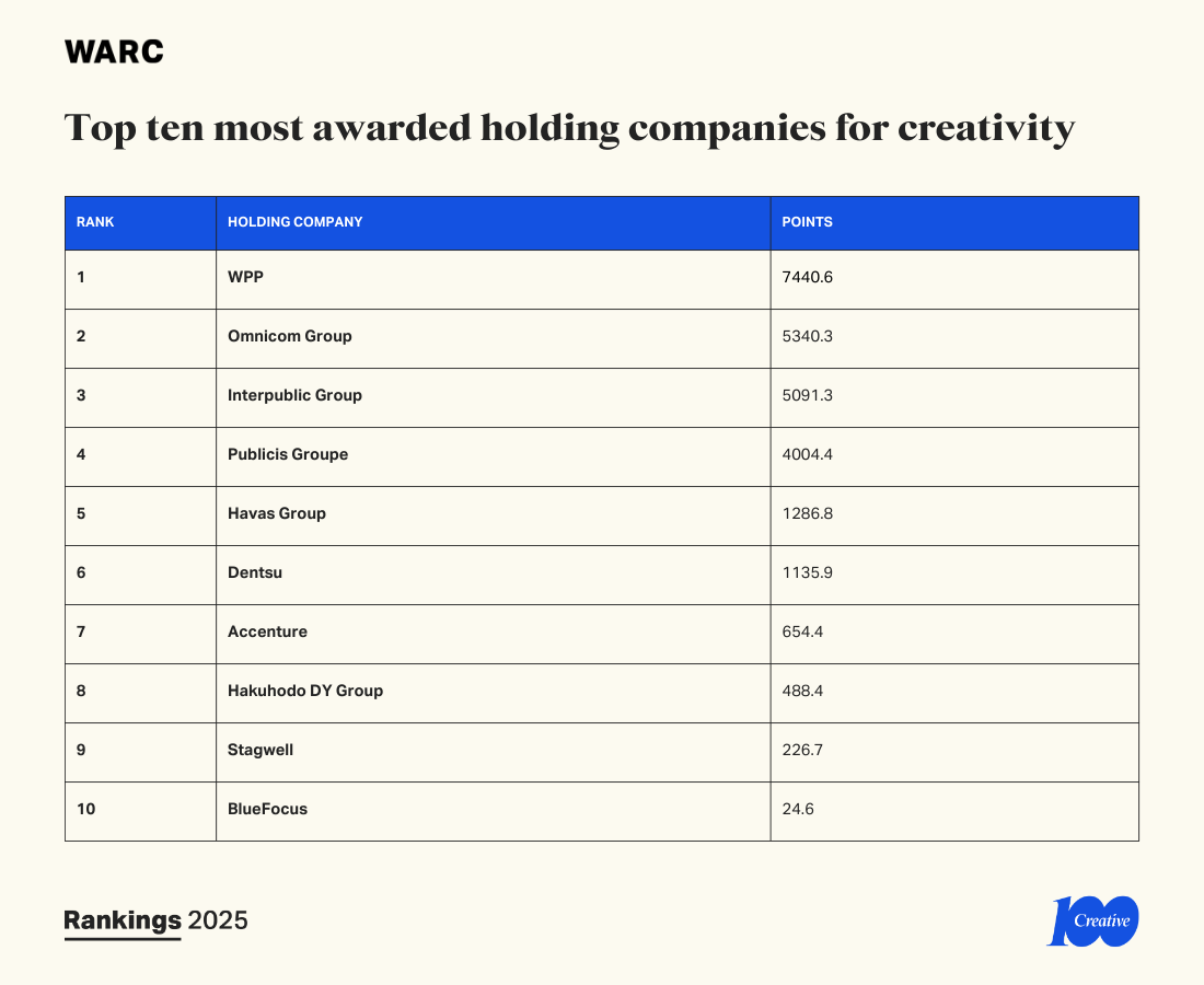 Compiled by WARC Creative, helping companies deliver creative marketing that works, the annual Creative 100 Ranking brings together the results of the most important global and regional creative awards of 2024. The shows tracked are determined in consultation with the WARC Rankings Advisory Board and by a yearly global panel survey.