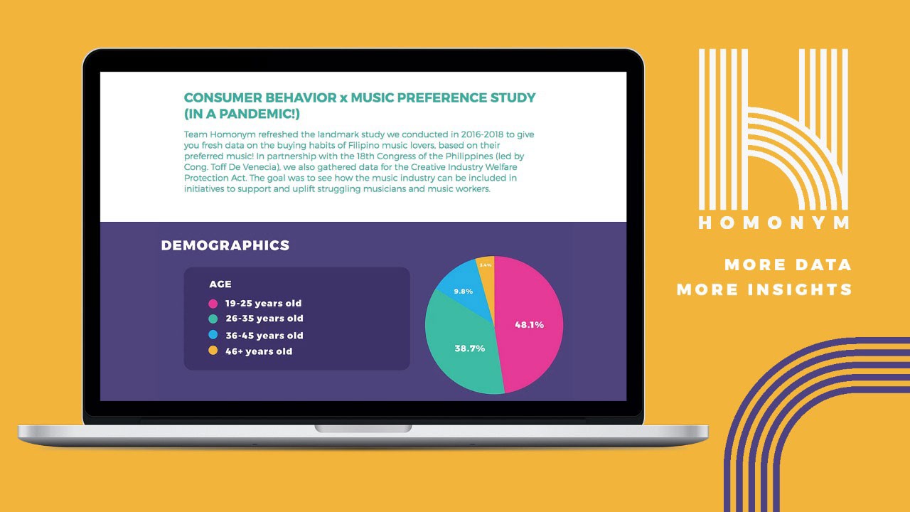 Homonym refreshed the landmark study they conducted in 2016-2018 to glean fresh data on the buying habits of Filipino music lovers, based on their preferred music. In partnership with the 18th Congress of the Philippines (led by Congressman Toff De Venecia), they also gathered data for the Creative Industry Welfare Protection Act. The goal was to see how the music industry can be included in initiatives to support and uplift struggling musicians and music workers in the midst of a pandemic.