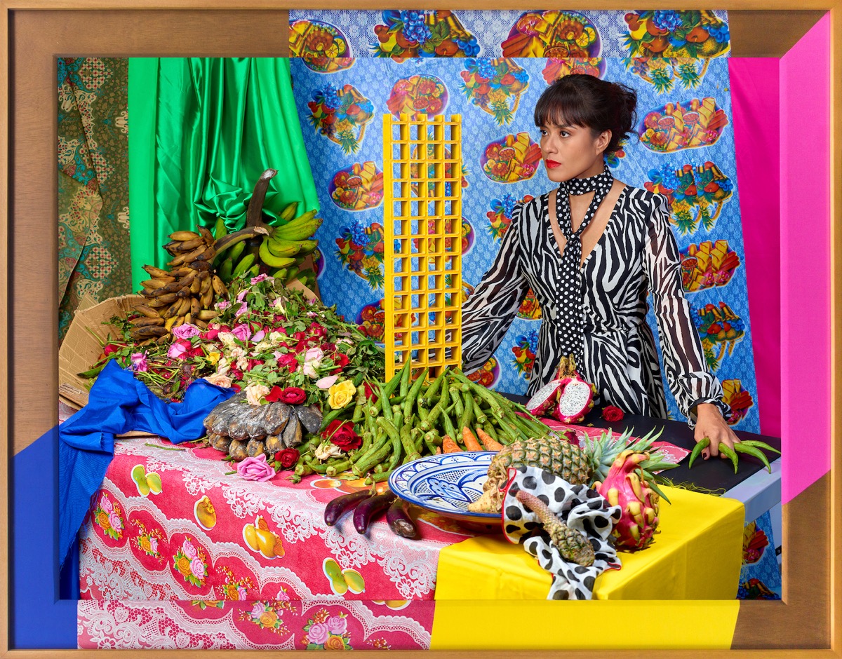 The prominent elements happening is a table still life that seems to cascade and it’s a burst of colors, a lot of surface, a lot of print and solids and you can even see for this whole exhibition but more so in this particular work — I had the image spill out of the frame which I used the actual fabric to extend from the photograph so the actual material so I’ve chosen this piece as some sort of a marker for my 40th year.