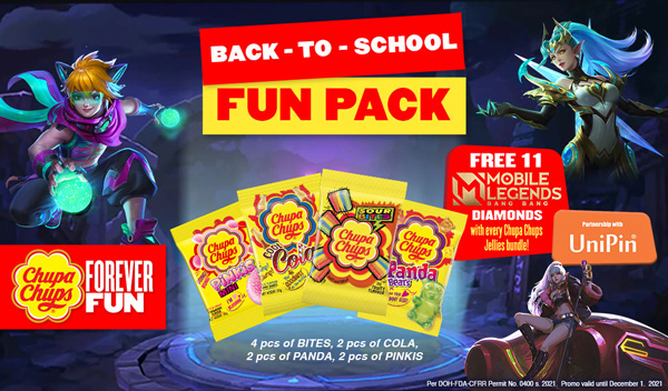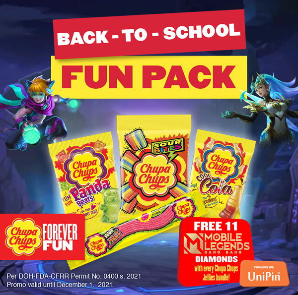 MANILA, PHILIPPINES — The Chupa Chups Jellies Back to School Fun Packs just made playing your favourite mobile game more fun. Chupa Chups targets gamers together with the popular mobile game, Mobile Legends: Bang Bang (MLBB) and leading digital entertainment enabler, UniPin. The Back to School Fun Pack includes PHP 10 UniPin Voucher to be used for 11 Mobile Legends Diamonds.