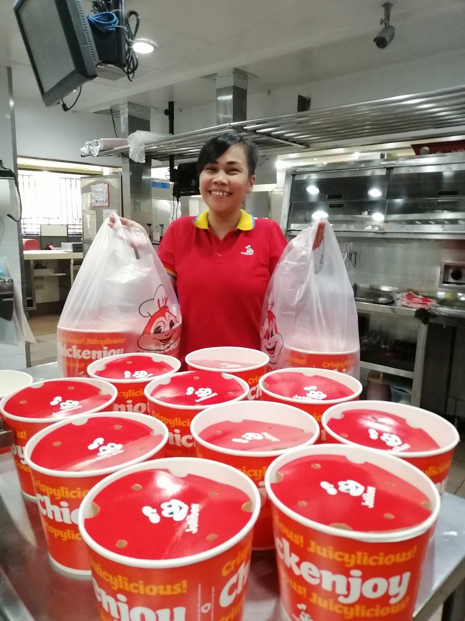 The Jollibee Manila City Plaza branch in Quiapo, where Ryu and Cecile are assigned, was tasked with providing food aid to front liners. But with the implementation of the enhanced community quarantine, manpower issues arose, leaving Ryu and Cecile the only ones available to take on the task. Undeterred and motivated by their desire to make a difference in their own little ways, the two worked hard together to prepare food packs — Ryu handled the batching and cooking of Chickenjoy while Cecile handled their assembly. Lending a helping hand as well was Cecile’s husband, himself a former Jollibee crew member.