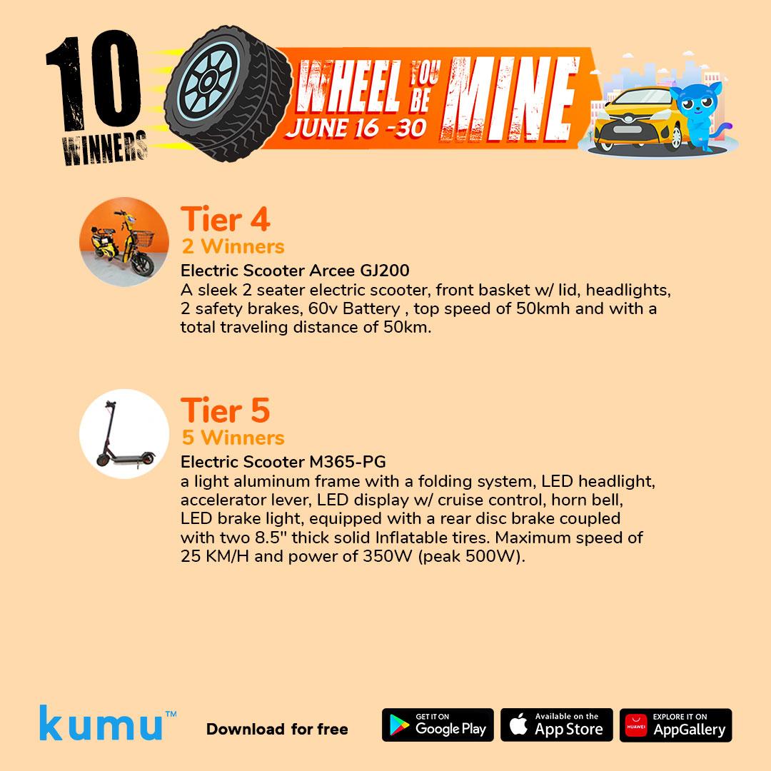 Tier 4 will have two (2) winners, each bringing home an Electric Scooter Arcee GJ200; and finally, Tier 5 will have five (5) lucky winners, each bringing home an Electric Scooter M365- PG.