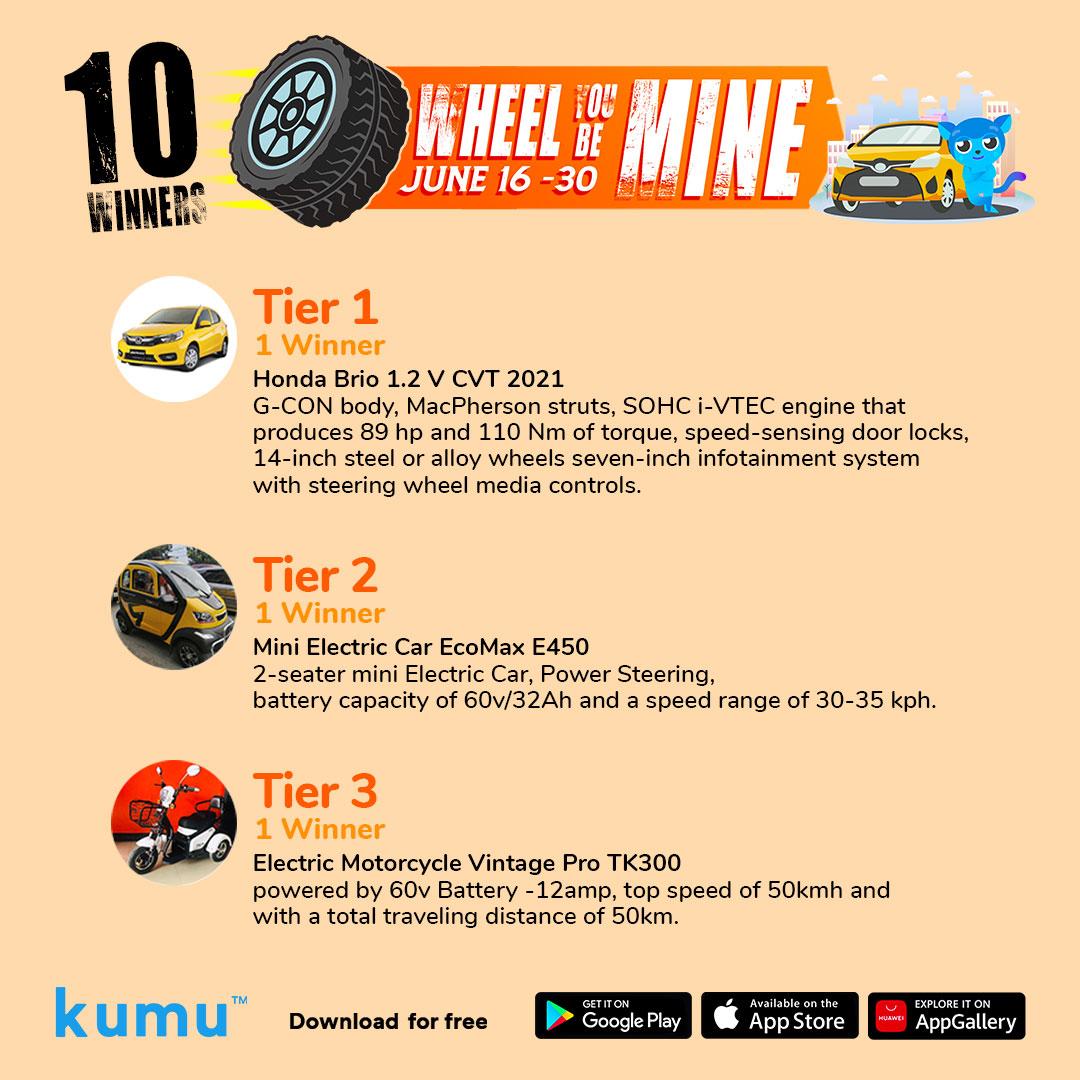 MANILA, PHILIPPINES — Need a ride? Well, if you go live on kumu this month, you might just win yourself your own car! The new “Wheel You Be Mine” kumu campaign has just raised the standard for hot prizes, with cars, a motorcycle and scooters to be won. Running from June 16 to 30th, 2021, “Wheel You Be Mine” is guaranteed to have some streamers revving for that leaderboard.