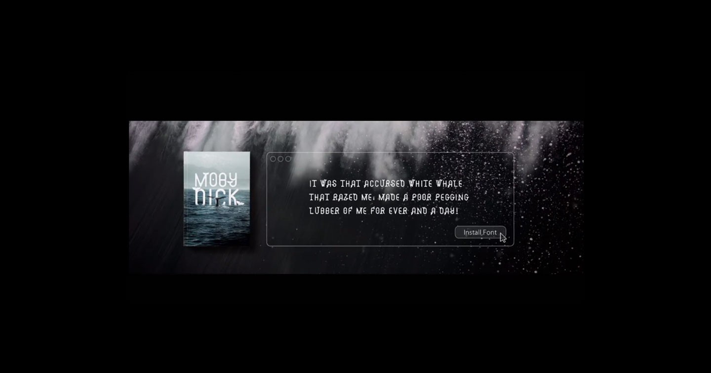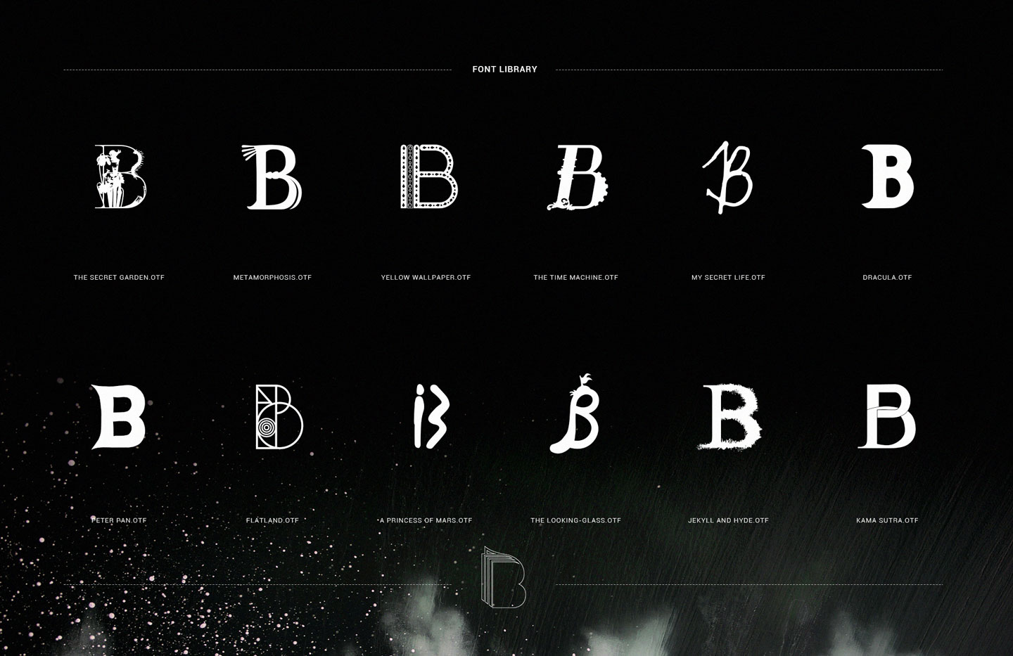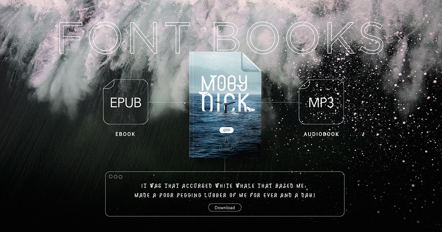 Taken from the original concept from Edu, instead of the generic font preview that is typically used, such as “The quick brown fox jumps over the lazy dog,” Font Books uses custom excerpts taken from the novels that inspired the fonts, such as “It was that accursed white whale that razed me; made a poor pegging lubber of me for ever and a day!” (Moby Dick) and “One morning, when Gregor Samsa woke from troubled dreams, he found himself transformed in his bed into a horrible vermin.” (The Metamorphosis.)