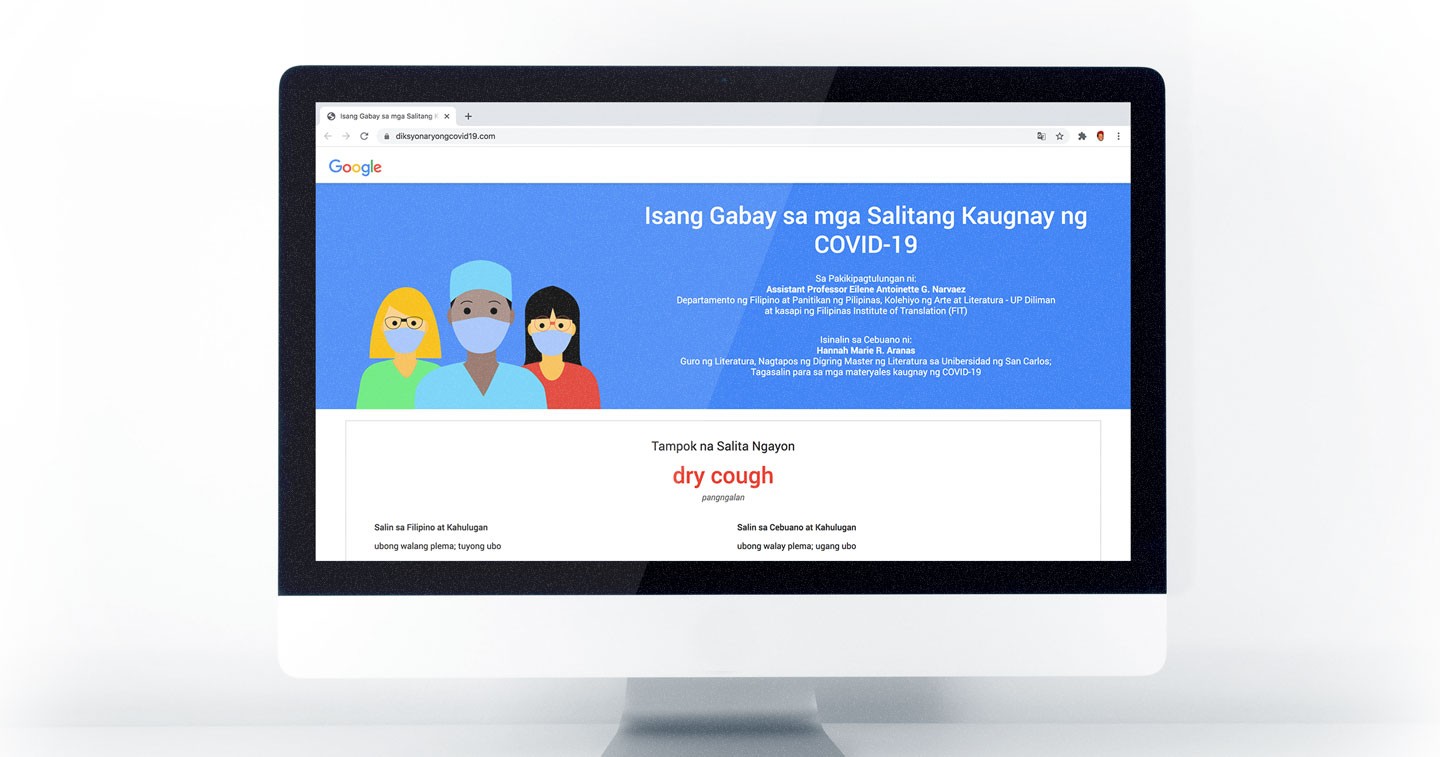 For the Filipino terms, Google Philippines collaborated with Assistant Professor Eilene Antoinette G. Narvaez of the Department of Filipino and Philippine Literature at the University of the Philippines Diliman, who is also a member of the Filipinas Institute of Translation (FIT). The Cebuano counterpart was completed with Hannah Marie R. Aranas, former literature teacher of the University of San Carlos Department of Languages and Literature, and translator of COVID-19 materials.