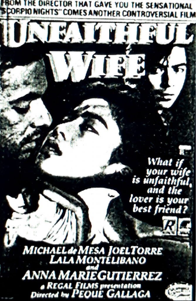 Unfaithful Wife stars Joel Torre (Fidel), Ana Marie Gutierrez (Irene), and Michael De Mesa (Crispin). The story unfolds with Fidel who was devastated over the death of his wife. He tries to resume his normal life by turning to his old friend Crispin and wife Irene. Fidel makes some effort with another woman but fails, and he soon finds himself in Irene’s arms. That same evening a young girl is brutally murdered. Fidel, unable to account for his whereabouts, is named the prime suspect and eventually put to jail. Crispin, meanwhile, learns of Irene’s infidelity. His friendship is put to the test when Fidel escapes, gets wounded, and asks Crispin to kill him and put him out of misery.