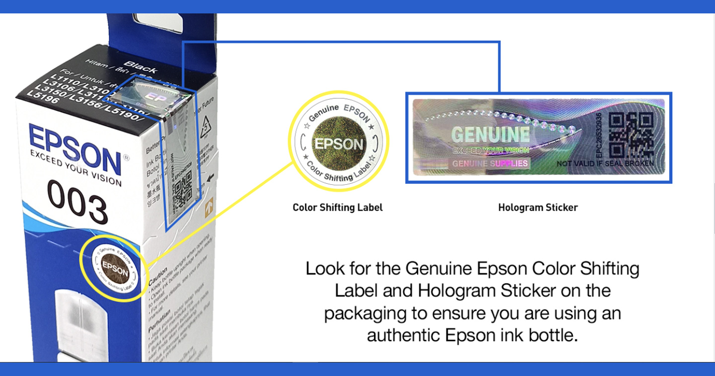 Stop the spread of counterfeit Epson inks by reporting to Epson via this link or reaching out to Epson’s Customer Support hotline. All reports will be automatically sent to the Customer Care Team. You can also visit Epson’s page for more information on our genuine Epson supplies.