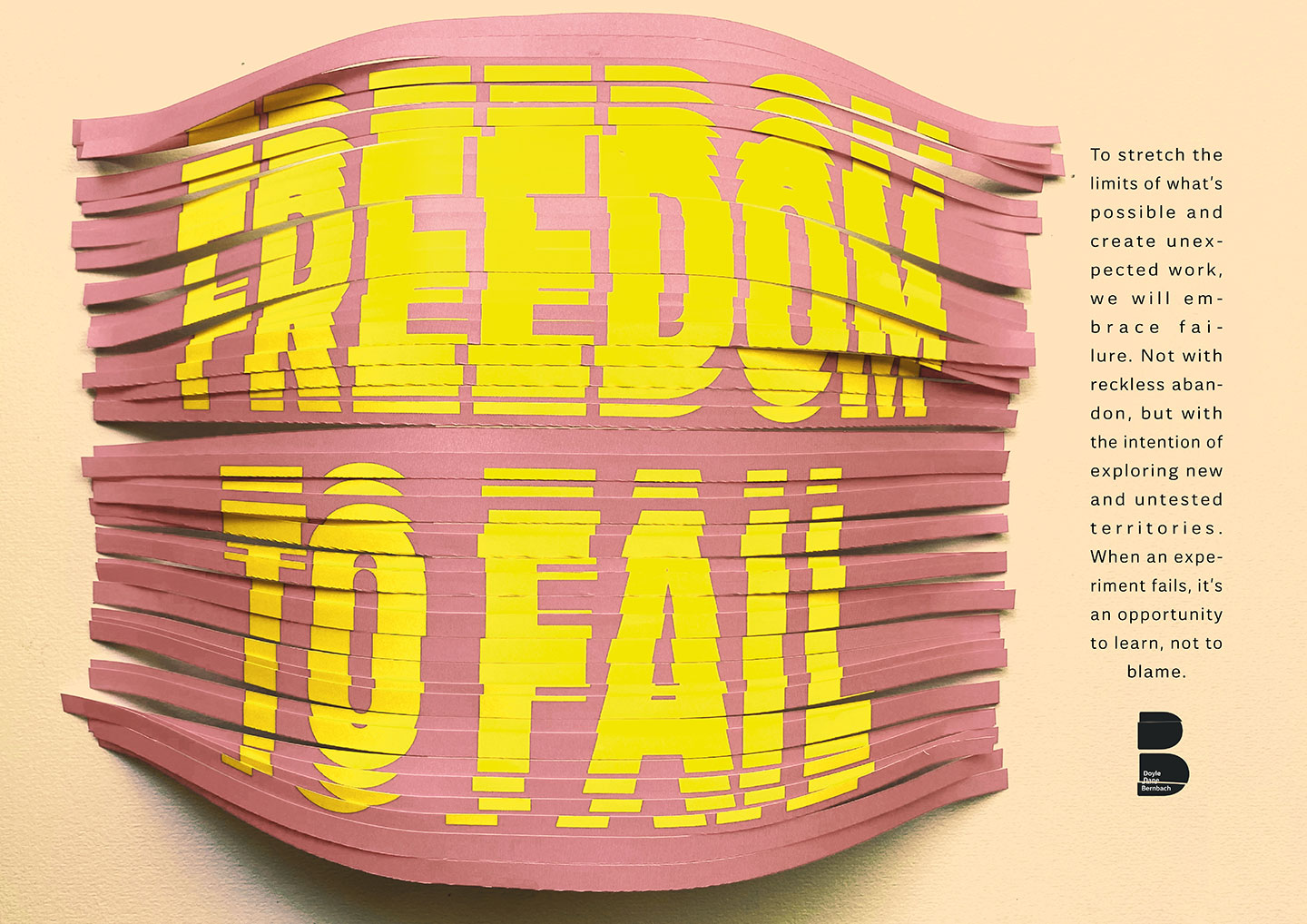∙ Freedom to Fail - To stretch the limits of what’s possible and create unexpected work, we will embrace failure. Not with reckless abandon, but with the intention of exploring new and untested territories. When an experiment fails, it’s an opportunity to learn, not to blame.
