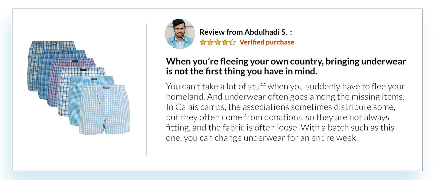 In light of this alarming situation, L’Auberge des Migrants had to remind the public of their critical role supporting and helping migrants survive. How? By drawing attention directly to the website that has seen record numbers of visitors this winter: Amazon.