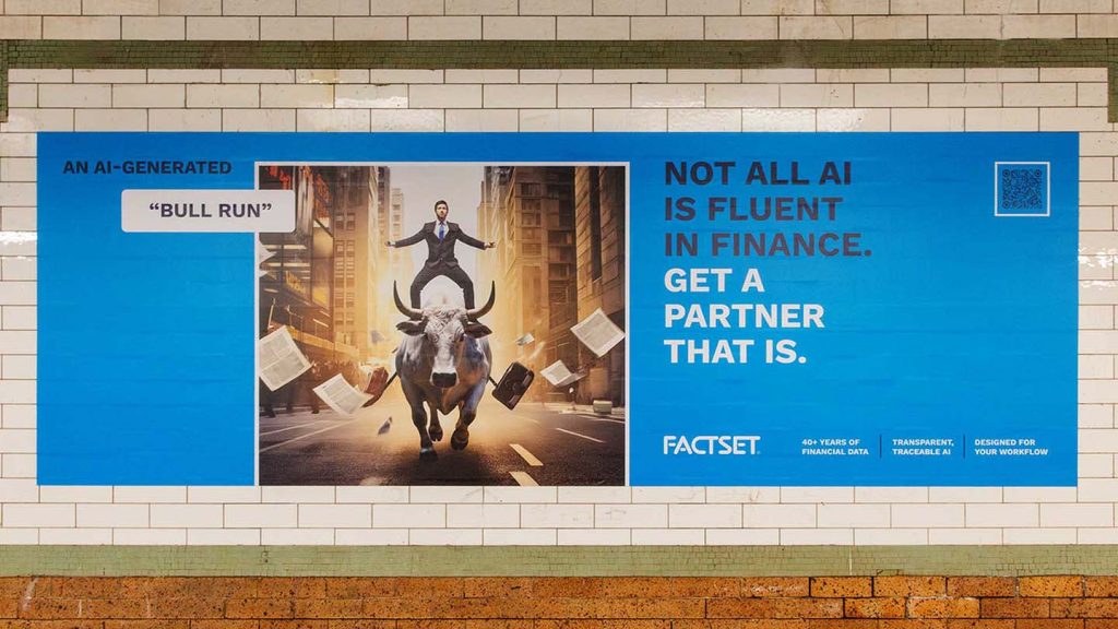 The campaign, which builds on the success of FactSet’s award-winning 2023 “Not Just the Facts” brand initiative, includes four new video spots and a comprehensive out-of-home takeover of New York’s financial district. Both components leverage humorous, provocative creative to assert FactSet’s position as an industry leader at the inflection point of AI adoption.