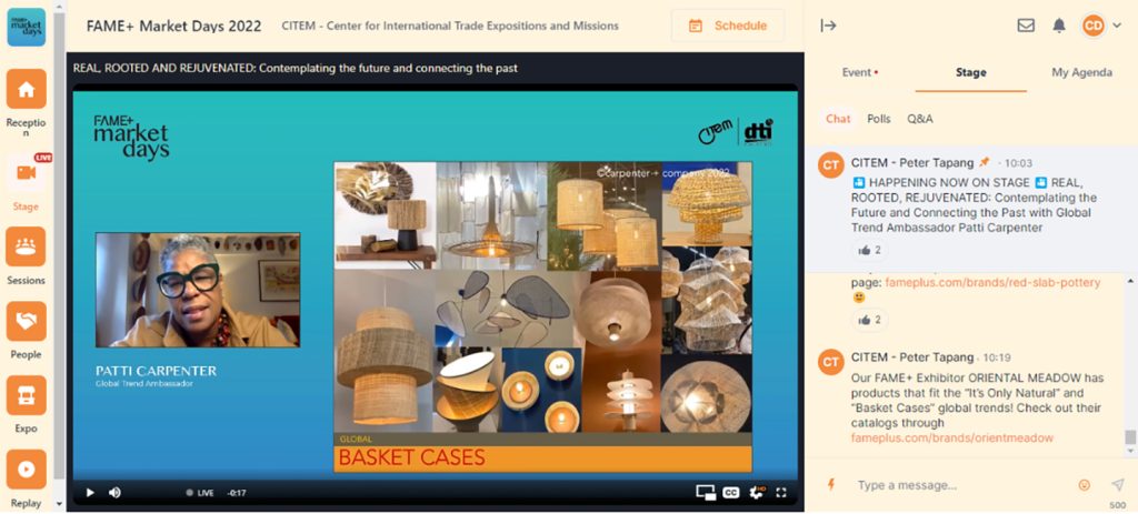 CITEM’s OIC Deputy Executive Director Ma. Lourdes D. Mediran, in her welcome message, said that the digital event is a key component in strengthening the FAME brand in the digital sphere. “The ultimate goal in staging this year’s FAME+ Market Days is to spur an in-depth engagement with buyers as exhibitors present their design products,” she added.