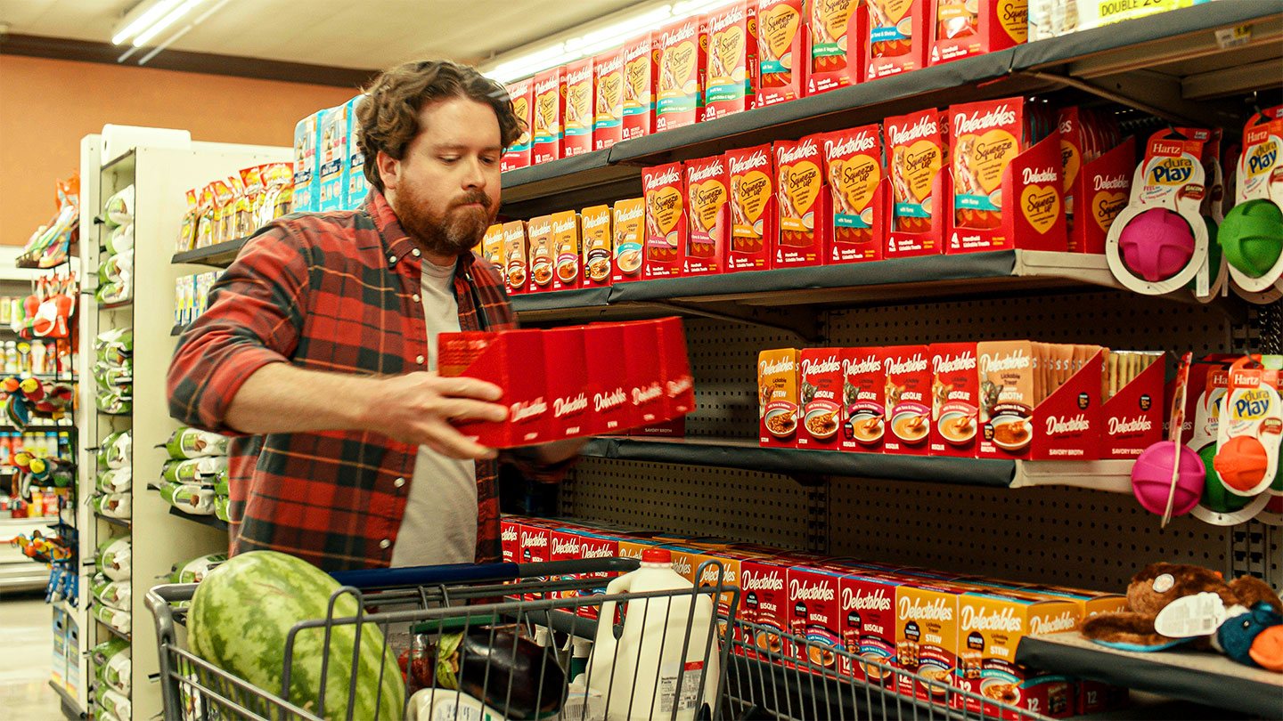 The campaign, entitled “Deliciously De-Lick-able Delectables,” focused on two spots reinforcing the Delectables name in a fun direction through alliteration and repetition. “Grocery Store” featured a wife asking her husband to quickly stock up on more Delectables Lickable Treat while their meowing cats enthusiastically lick their bowls clean.