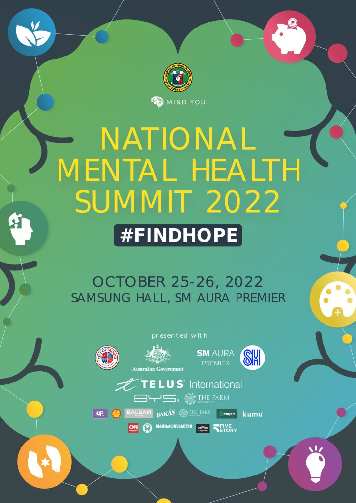 The National Mental Health Summit 2022 is not possible without the Department of Health, The Australian Embassy, SM Aura Premier and the City of Taguig and sponsors such as Break Your Stigma (BYS), TELUS International Philippines, The Farm at San Benito, live streaming giants Uplive and Kumu, media partners Manila Bulletin, CNN Philippines, adobo Magazine and WheInManila.com.