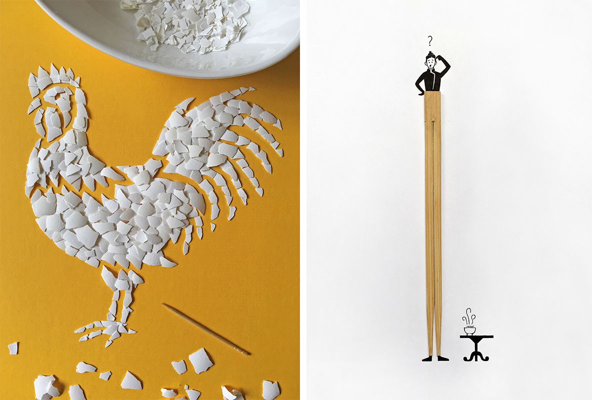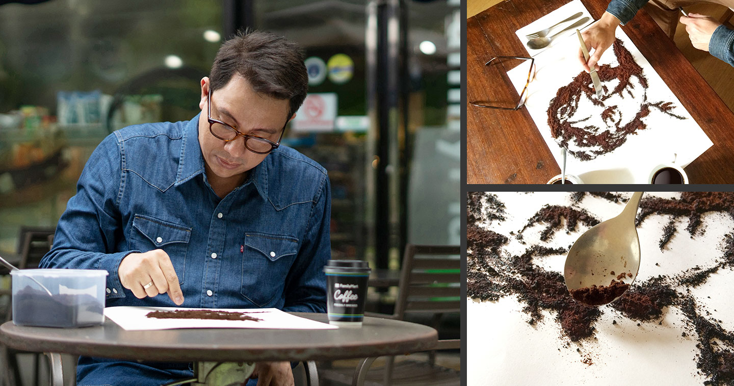 In terms of medium and materials, how would you describe your art form? You use coffee grounds to do your art, eggshells, chopsticks, illustrations, type, etc. How were you able to hone this talent and please describe your process?