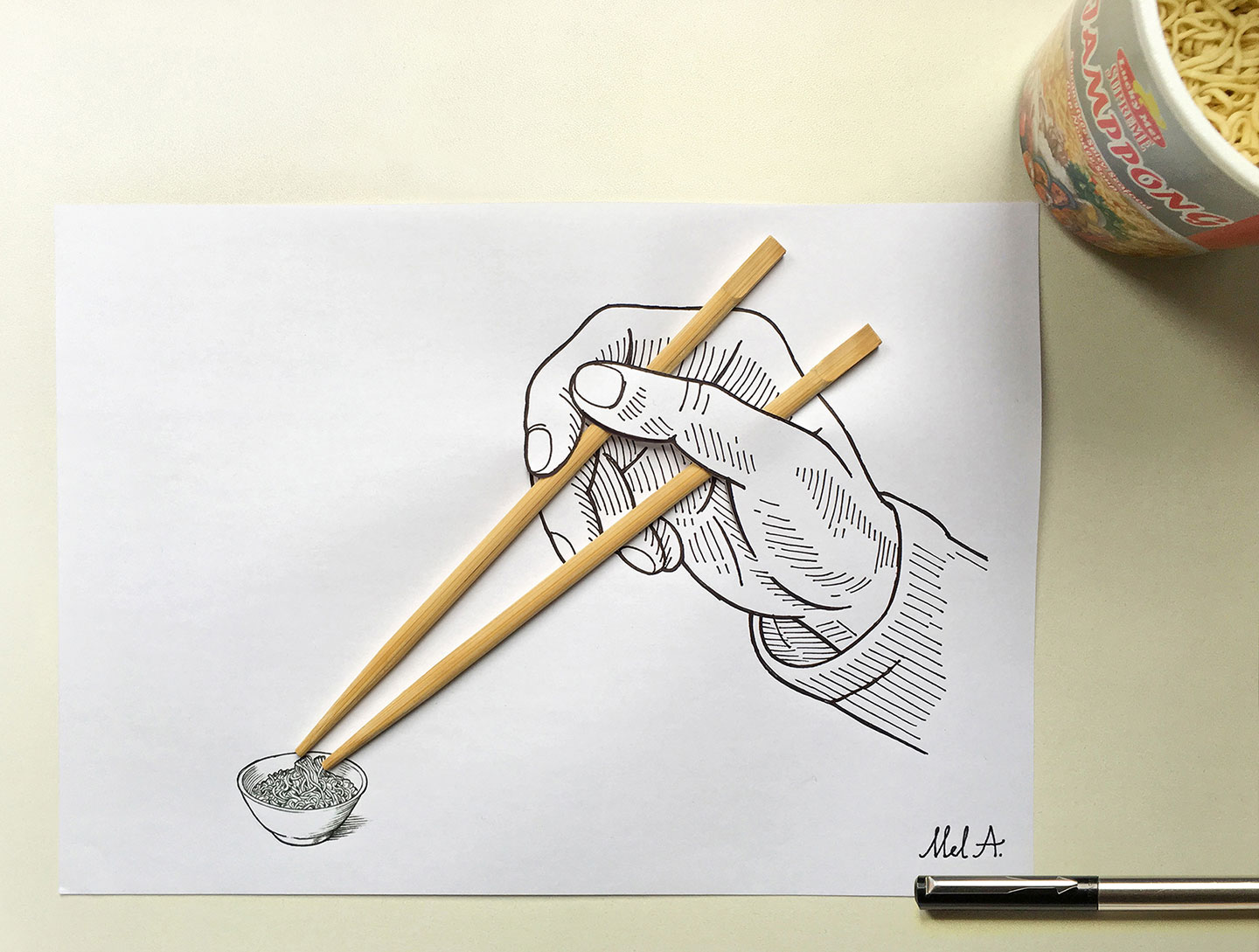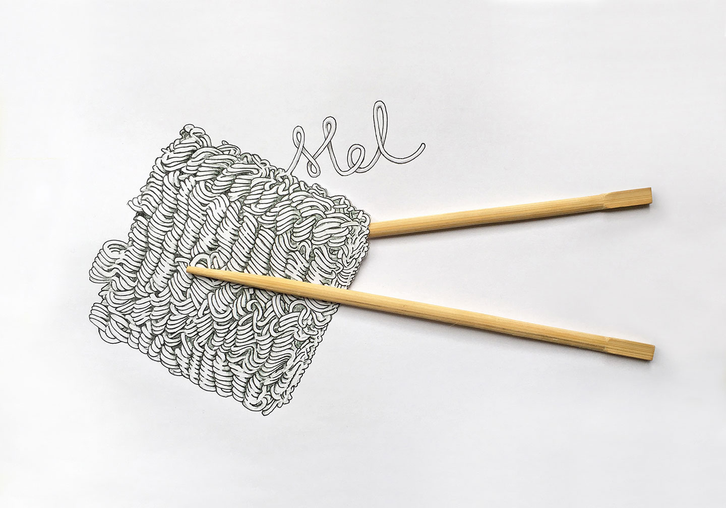 Illustration using pencil for sketching, a tech pen for final outline and chopsticks.