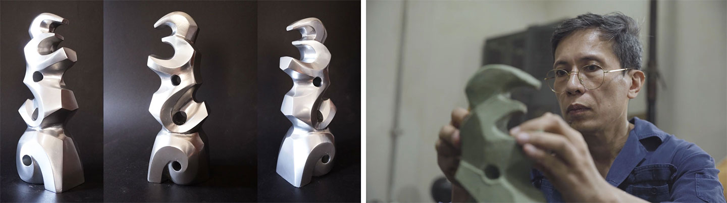 The work was referenced from a clip of two Sumo fighters. The artist spliced the clip into different frames and drew studies from it “to capture the sensation of each body part towards the other.” He proceeded with sketching, preparing the armature, sculpting the model, then finally, casting. Through this rigorous process, the artist emphasized his affinity for the human body and “its inner dynamic sensation” in Politika. The aluminum metal work clearly displays the artist’s mastery over the medium as he re-contextualizes fluidity and solidity in one piece. The metal’s fluidity adds depth and dynamism to the whole piece, synthesizing every moment.