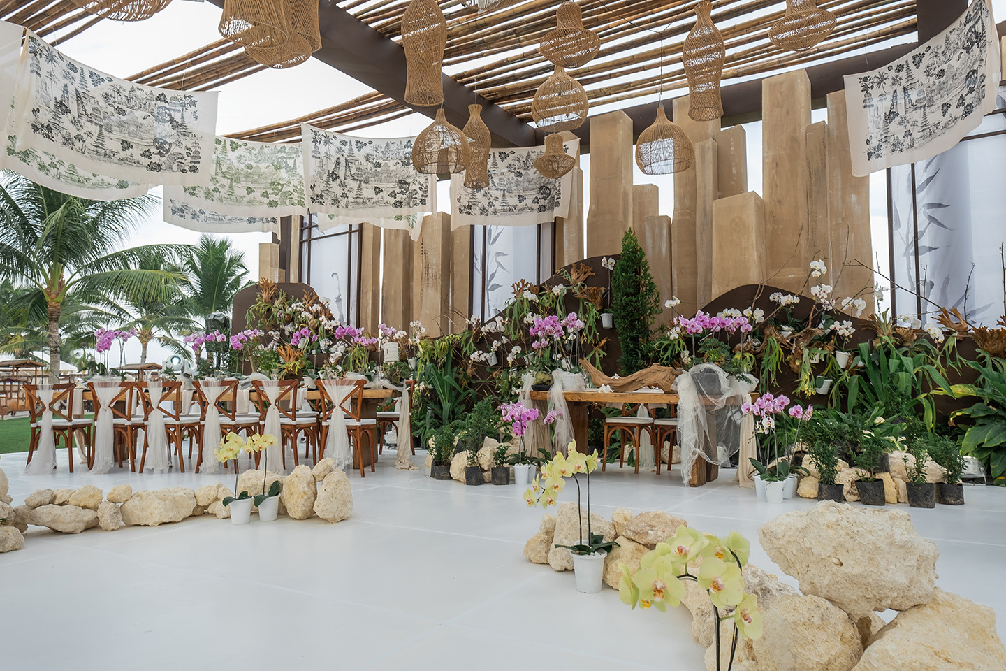 Designmill Co. joined the project to lend their expertise with the decoration. Recycled paper papeteries, wooden chairs and potted plants are utilised to decorate the venue, with hanging natural fabric and printed customised motifs. The event decorator has brought fashion label Kaeen, who are known for sharing Indonesian creativity through their fabric.