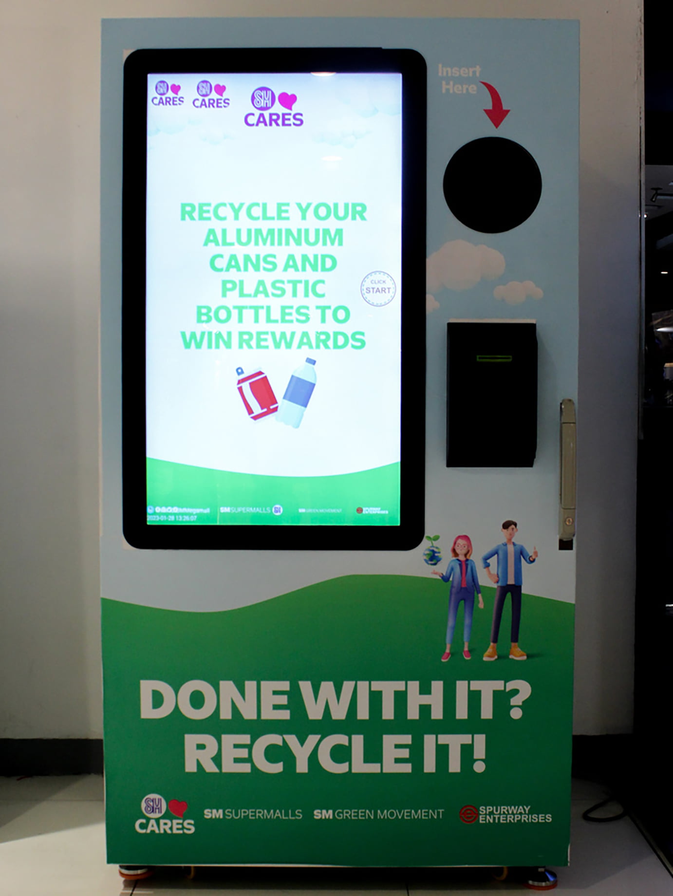 For every 1,000 mL worth of polyethylene terephthalate or PET bottles and/or aluminum soda cans deposited, the customer can choose one of the following reward discounts: 15% off at SM Skating, or 15% off at SM Bowling. The machine will then print a voucher that the customer can use to redeem their discount. Customers can use one discount per transaction, and it must be claimed within 60 days from date of issuance, from Monday to Thursday in the following branches: SM Megamall, SM North EDSA, and SM Fairview (for SM Bowling); and SM Megamall and SM Mall of Asia (for SM Skating). Or, if the recycled items are less than 1,000 mL, proceeds will automatically go to SM Cares, which will support its various programs.