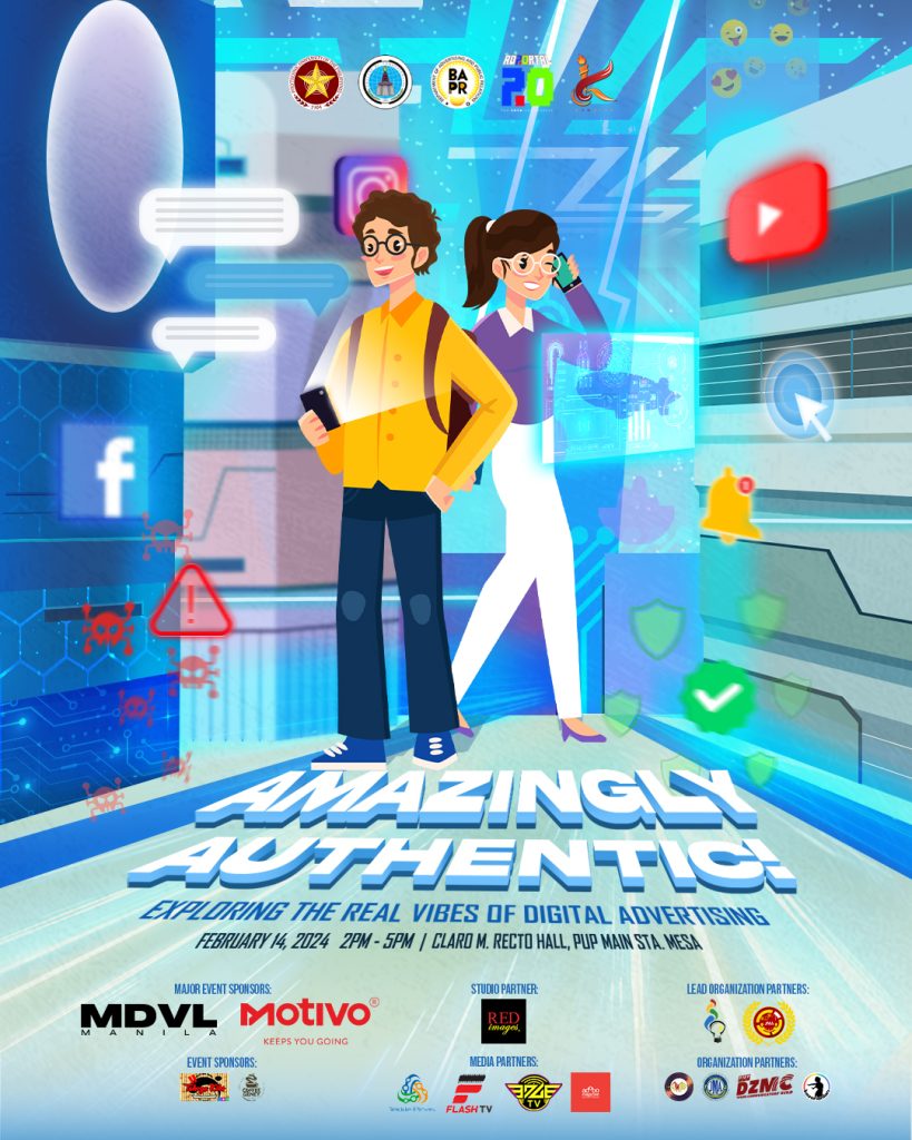 The Bachelor’s program in Advertising and Public Relations 4-1N, offered by the Department of Advertising and Public Relations within the College of Communication, is inviting advertising, marketing, and media-related practitioners on February 14 from 3:00 PM to 6:00 PM at Claro M. Recto Hall PUP Main, Sta. Mesa Manila, to their seminar titled “Amazingly Authentic! Exploring the Real Vibes of Digital Advertising.” This is dedicated to delving into the true essence of digital advertising and uncovering the crucial elements that contribute to its success.