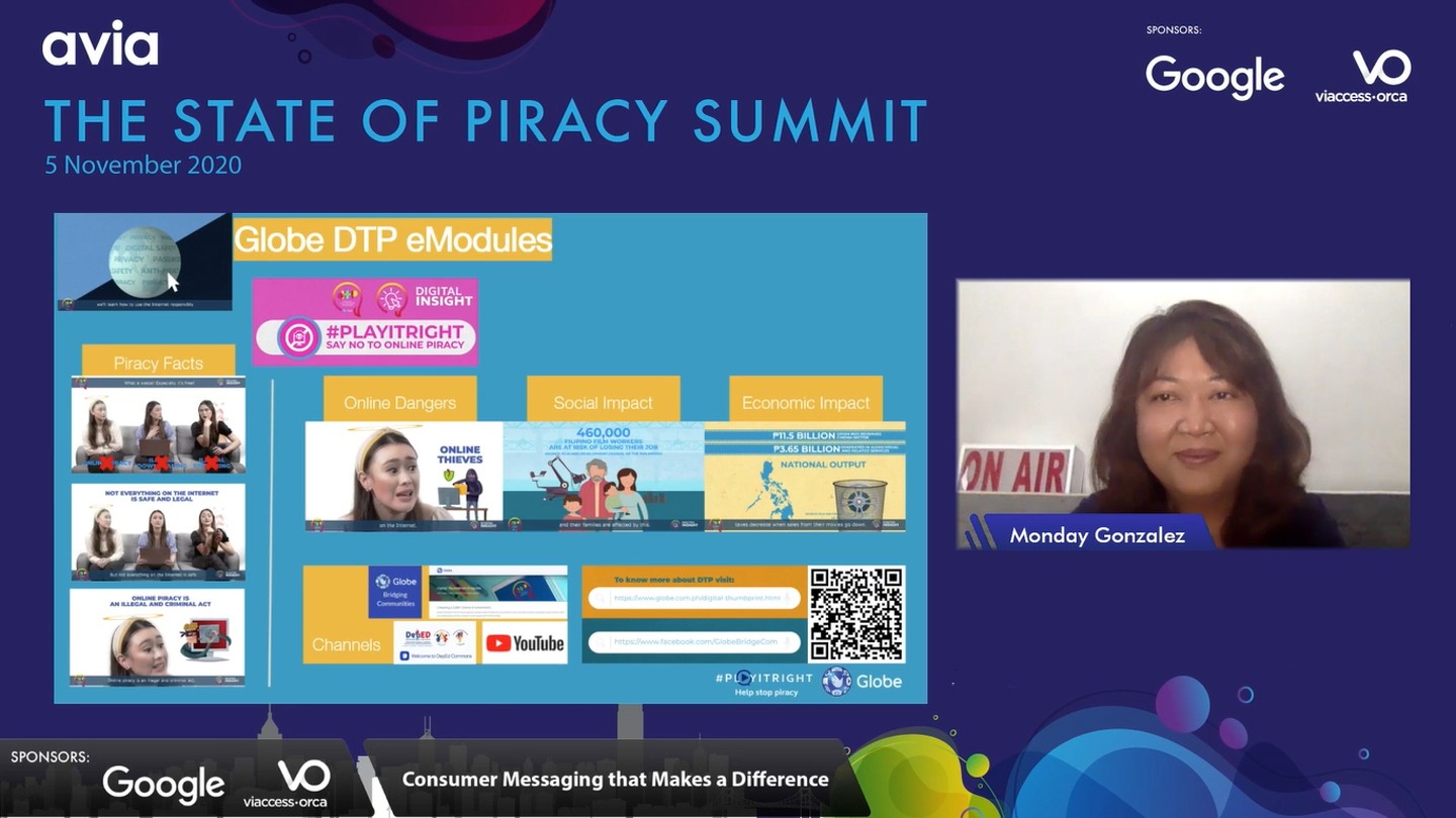 Consumers themselves are also key stakeholders in the campaign against piracy. With today’s low cost and easy access to content, consumers should no longer find a reason to consume pirated content. Globe has embraced the social responsibility of educating its customers to become responsible and intelligent custodians of content, by encouraging them to #PlayItRight. Launched in 2017 with two main pillars: to surface online dangers and illustrate the negative social impact brought about by piracy, #PlayItRight is a campaign that cuts across several industries: film, music, digital literacy and education. In one of the summit’s panels entitled “Consumer Messaging that Makes a Difference”, Monday Gonzalez, Globe’s Director for Content Management and Creative Services shared that “In the past three years we’ve tied up with various film organizations and production outlets, constantly coming out with the impacts of piracy on jobs and lives.”