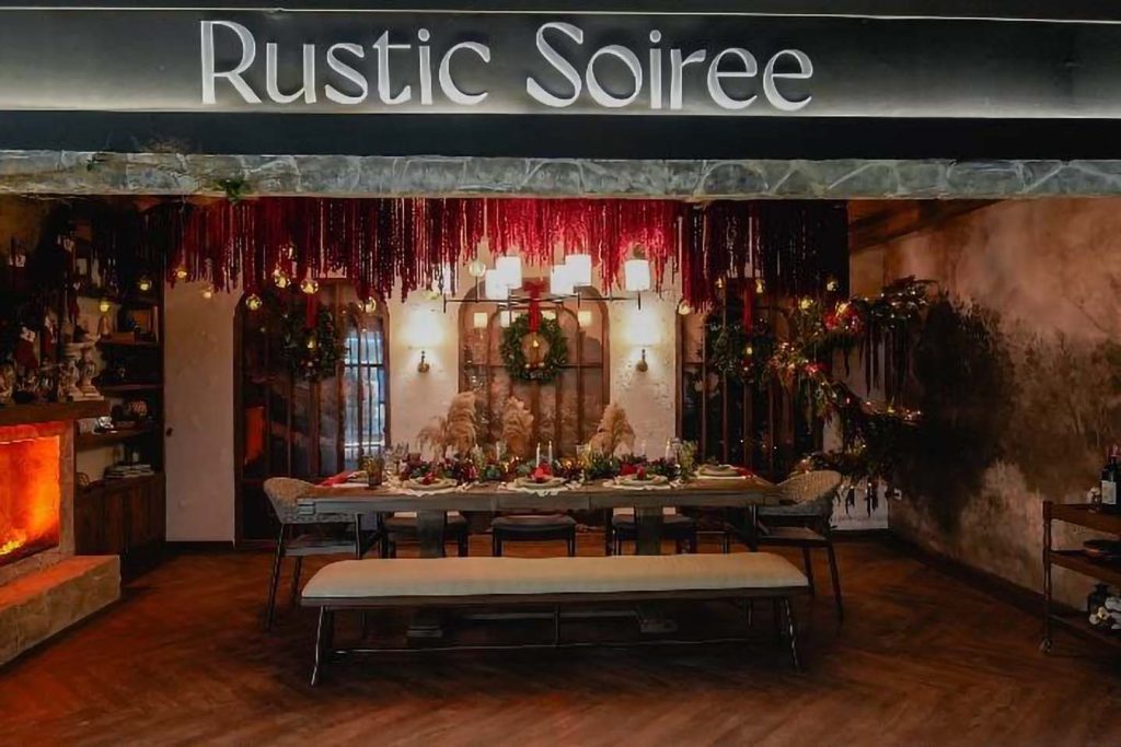 - Rustic Soirée. Evoking a French provincial Christmas Eve, this booth features a stone archway, wooden beams, a glowing hearth, and a ceiling-mounted Christmas tree, blending rustic warmth with sacred symbolism.