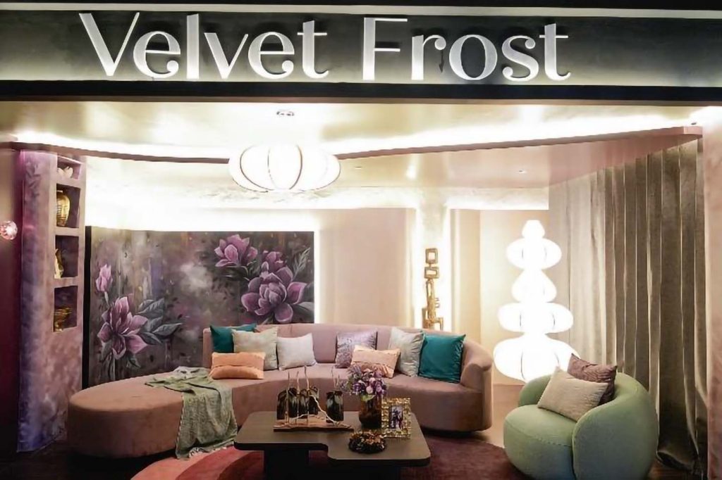- Velvet Frost. Inspired by chocolate plum and mint hues, this living room pairs a hand-painted floral mural with a sculptural tree lamp, reimagining holiday light and tradition.