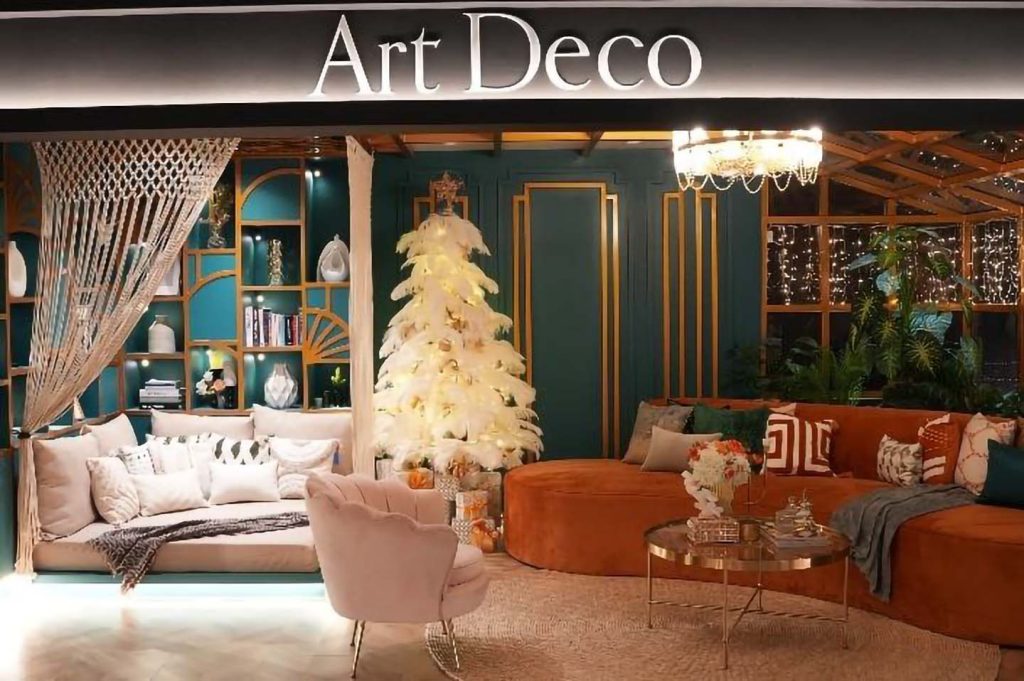 - Art Deco. Formal glamour meets Bohemian warmth in a Manhattan-inspired setting. Deep green walls, gold accents, velvet seating, and a feathered tree capture both elegance and memory.