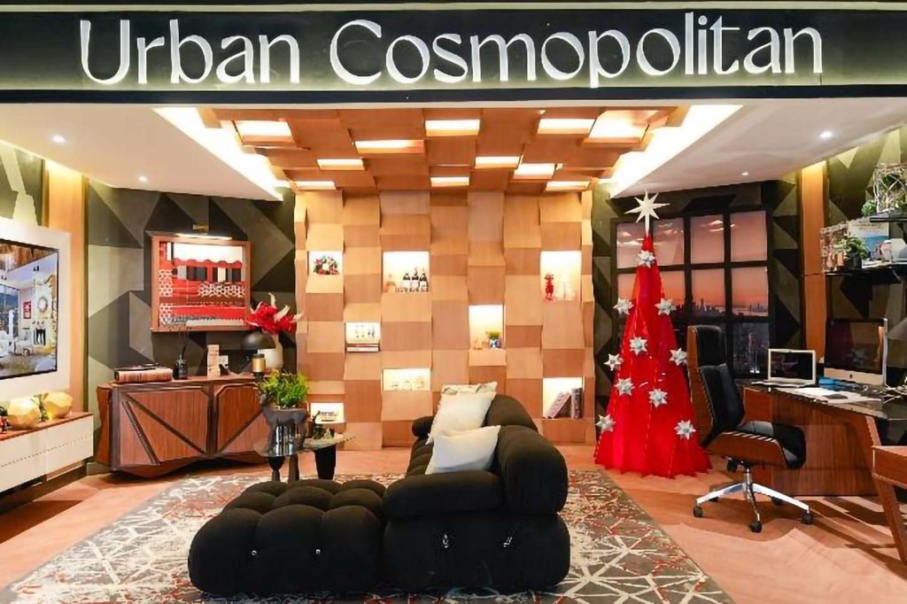 - Urban Cosmopolitan. A bachelor pad influenced by origami and geometry. Clean lines, angular furniture, and a statement red tree create a bold yet comfortable holiday setting.