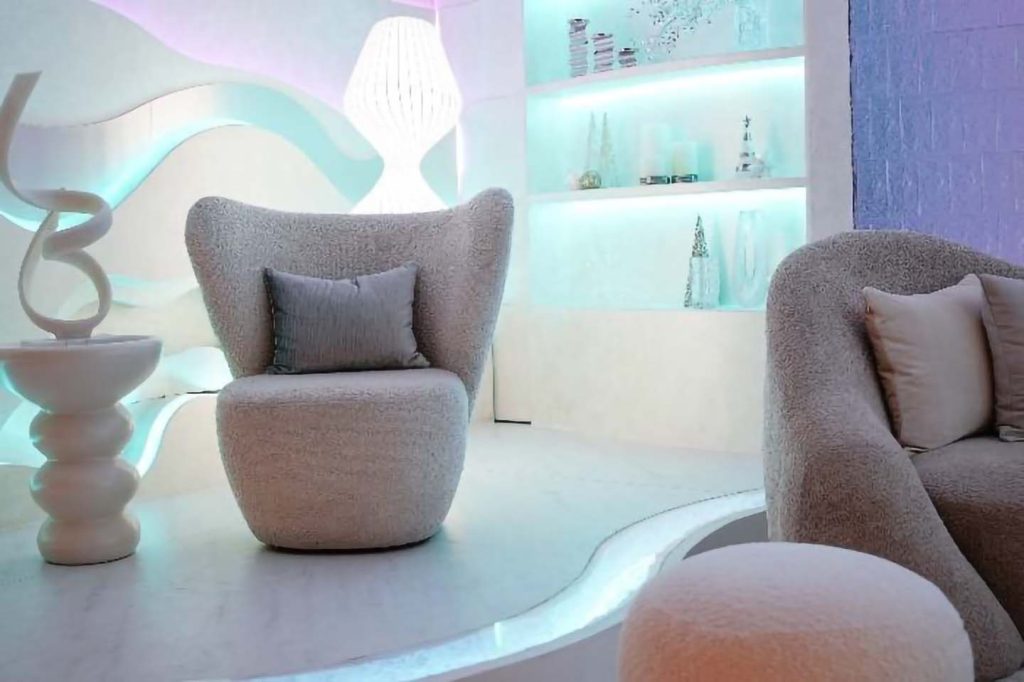 - Noël Aurora. An Icelandic-inspired room that shifts from serene daylight tones to crystalline hues at night, echoing the Northern Lights through light and texture.