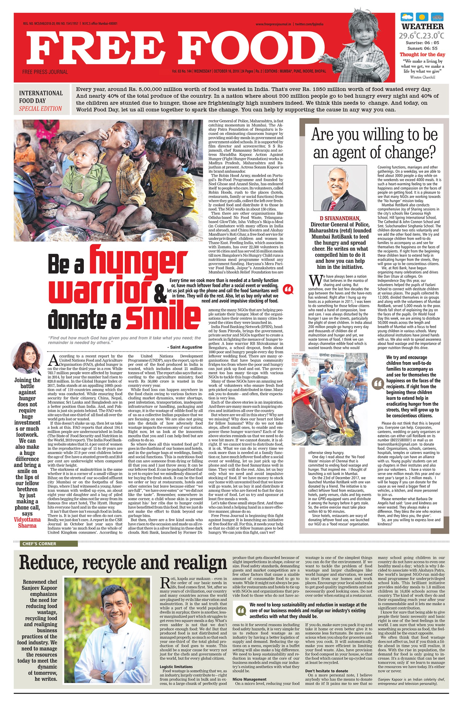 5,00,000 million is the value of the food that is wasted in India every year, while 40% for the total produce wasted. About 200 million people go to bed hungry every night. The publication felt the need to address the issue, which is why, on the occasion of World Food Day, Free Press Journal is dedicating two full pages to it, in an attempt to tackle the issue head-on.