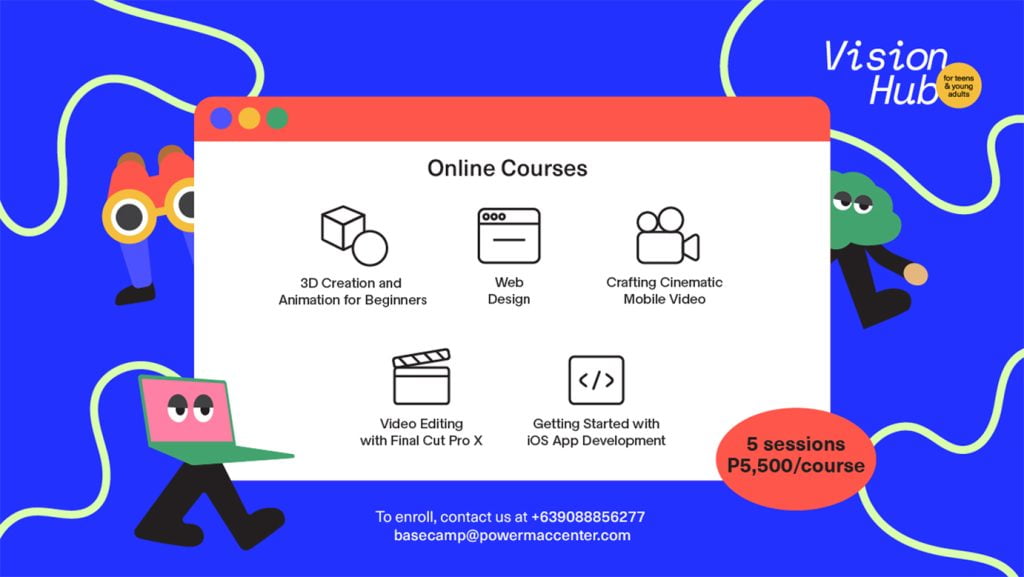 Design Trail classes are conducted over four days, for 1.5 hours each session. Digital courses are priced at PHP2,500 per student per course for online sessions, and P3,000 for face-to-face classes. Non-digital courses can be availed at PHP3,000 each. Vision Hub’s online courses are priced at PHP5,500 per head, per course, conducted over five days per course, for 15 hours in total.