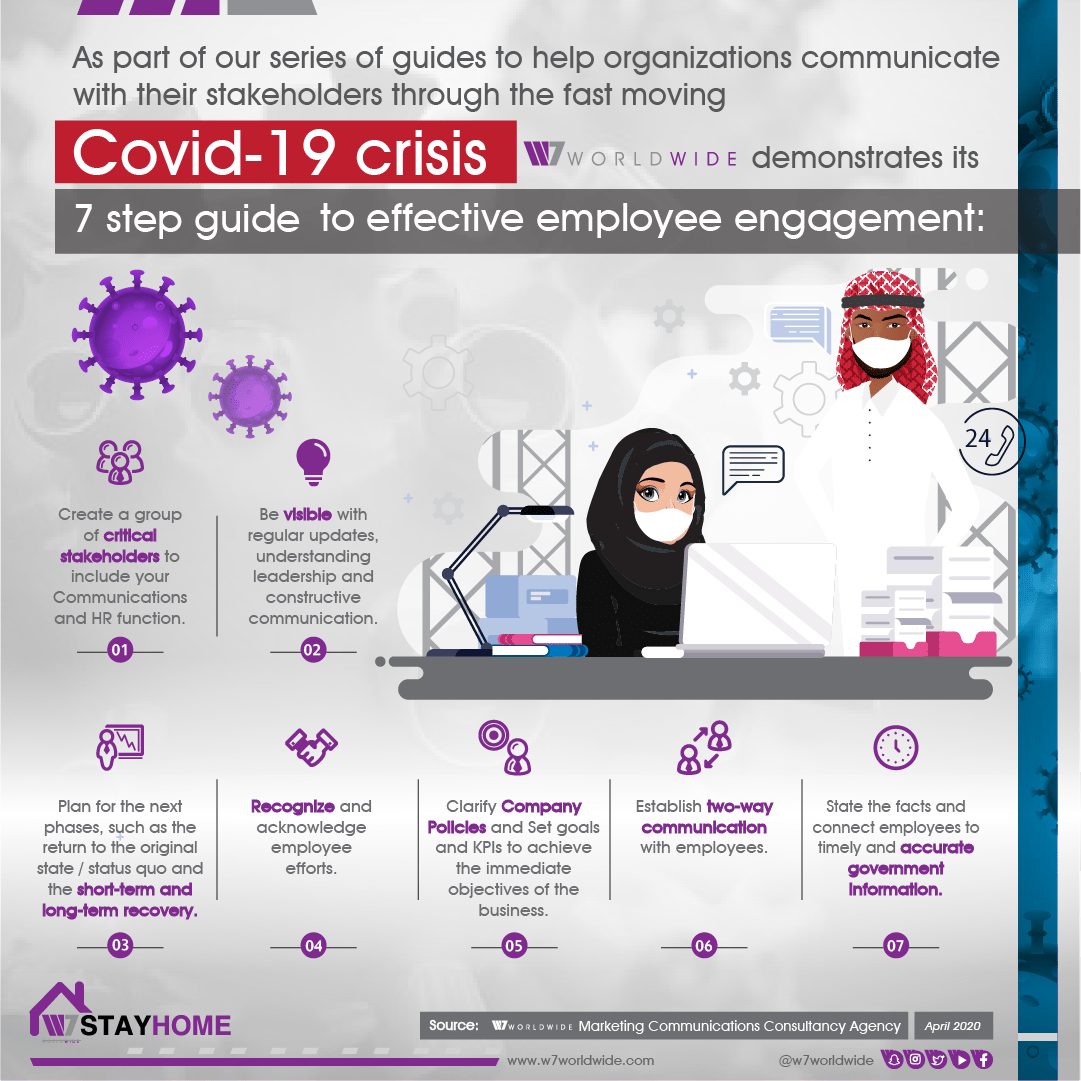 The Covid-19 Employee Engagement Guide is aimed at CEOs, HR managers and internal communications teams to equip them with a plan that will create the infrastructure and messaging required to protect the organization’s reputation and maintain the loyalty of their employees. W7Worldwide’s experienced Corporate Communications team is advising both local and international clients to help plan and manage their internal communications around Covid-19.