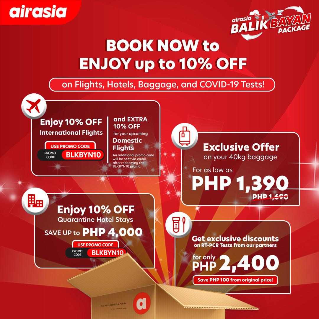 And to top it all off, AirAsia is also giving OFWs special discounts on 40kg baggage (Php1,390 discounted price), RT-PCR test (Php2,400 discounted price) and a maximum discount of Php4,000 on hotels for quarantine stay. All these exclusive offerings are made available at airasia.com and Super App.