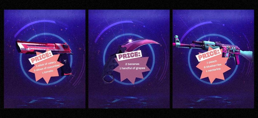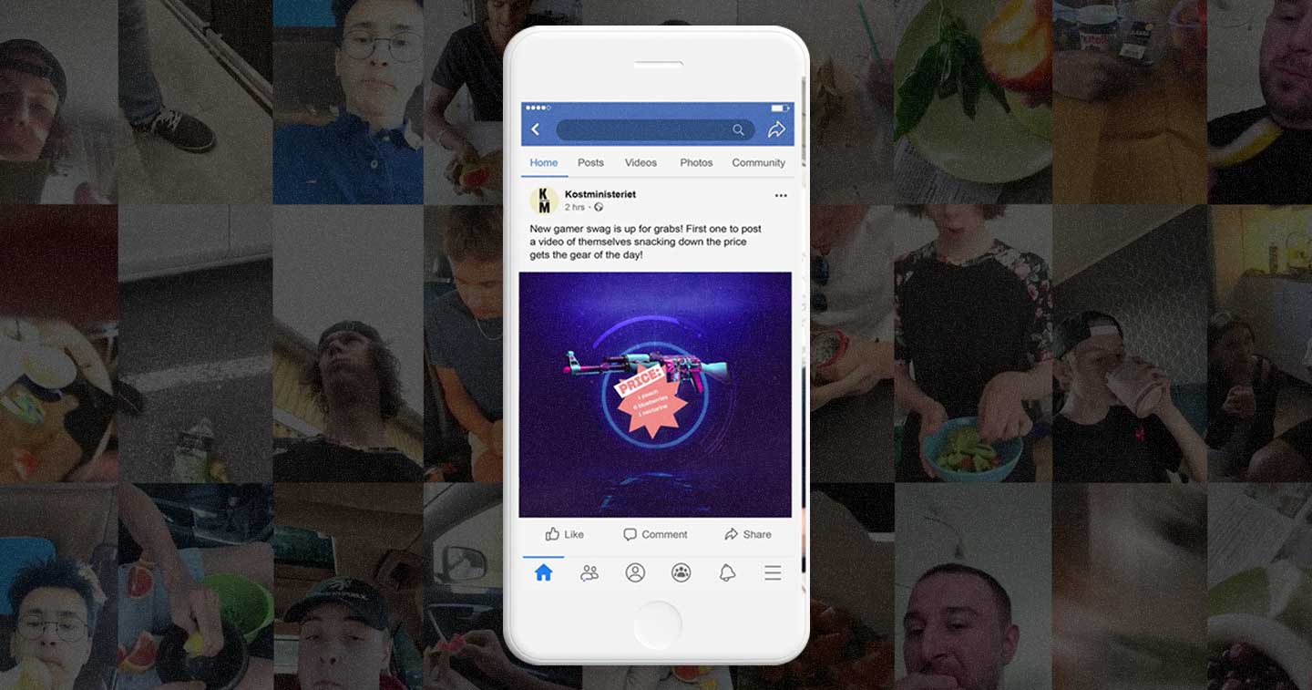 Young males aged 15 to 25 were offered exclusive gear and skins from some of the worlds most popular online-games such as CS GO, Leauge of Legends and the newly released Valorant. The catch? They had to pay for each gear by eating fruits and greens and prove it by posting a video of them doing it on Facebook!